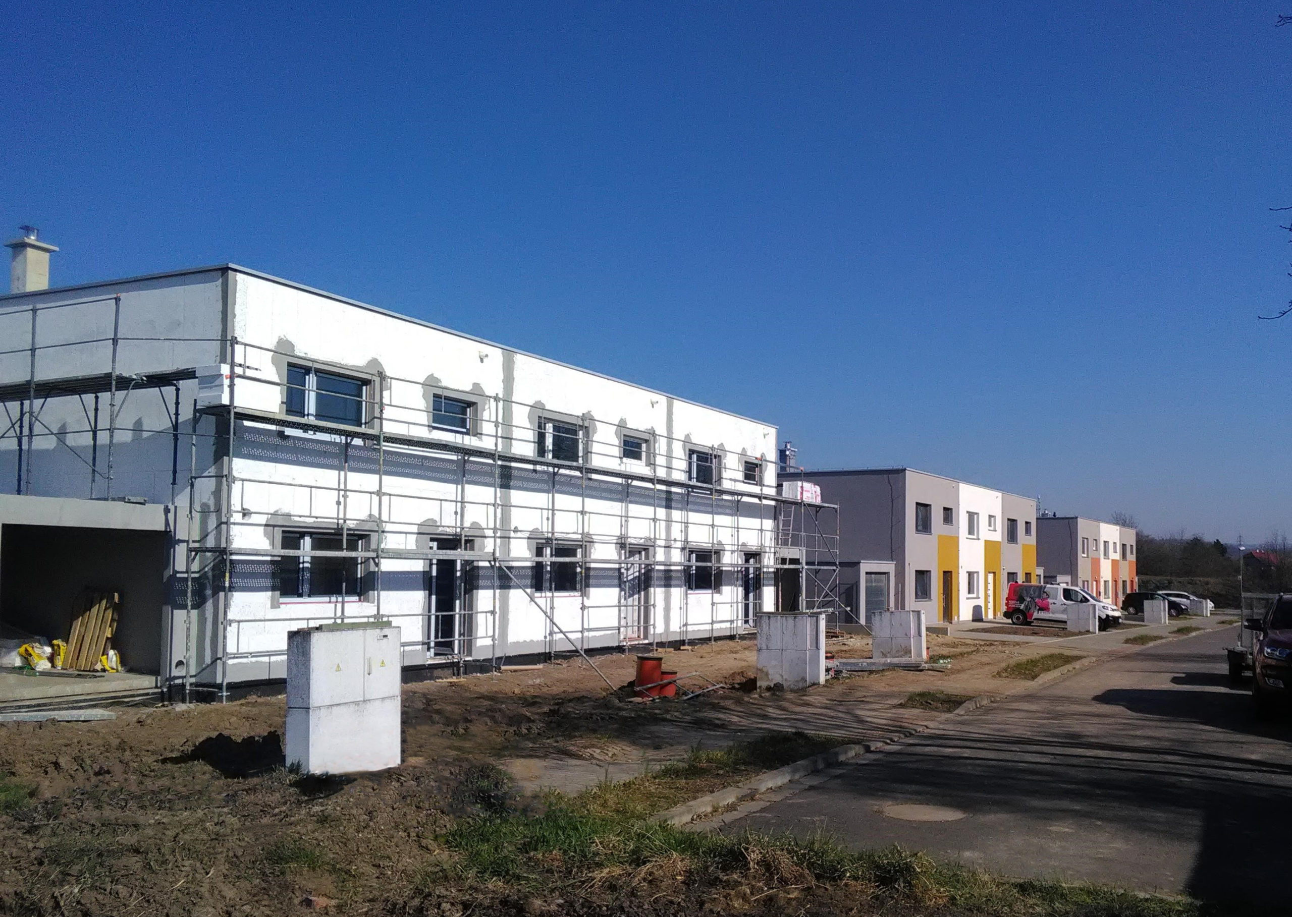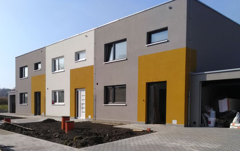 Aktuálně pracujeme na dokončení dvou trojdomů. Na domech č. 19, 20 a 21 probíhají vnitřní finální práce – malby, příprava na podlahoviny atd. Na druhém trojdumu (domy č. 16, 17 a 18) byla provedena realizace střešního pláště a aktuálně pracujeme zejména na fasádě, instalacích a skladbách podlah.