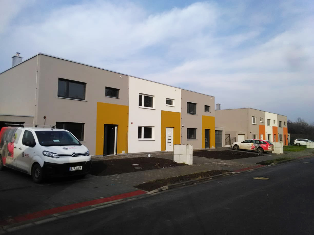Na našem nejnovějším trojdomu (č. 16, 17 a 18) probíhají práce především na zámkových dlažbách a terénních úpravách. Pracujeme také na trojdomu č. 19, 20, 21. Zde se již podařilo kompletně dokončit dům č. 21 a nyní probíhají vnitřní práce na domu č. 20. Prodán byl dům č. 17 – k prodeji zbývají tedy již jen 4 domy!